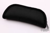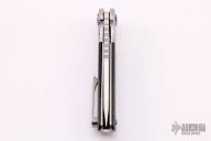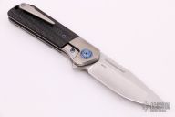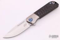This Lanny is a Liong Mah design executed by Reate Knives. It features a two-tone clip point blade with notched thumb rest, fullers and flipper. The handle is comprised of orange peel finished titanium bolsters with integral liners and carbon fiber scales, orange peel finished titanium backspacer and tip up clip that is reversible for left or right hand carry. Anodized titanium hardware and lanyard hole in pommel. Includes zippered case. Has some light scratches, otherwise good condition.