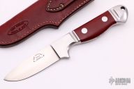 This Integral Hunter by Dave Kauffman features a hand rub satin finished blade, cryogenically treated, with .225" blade stock at the plunge line and .981" blade depth, integral construction with red linen micarta inlays. The guard and butt are fluted, the blade spine has a fuller, lanyard hole at the butt. Comes with a brown leather sheath made by Bison Saddlery. Excellent condition. Marked 91-94 on the tang