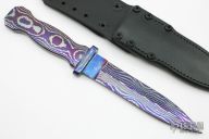 This One of a Kind Integral Dagger by Defiant7 features a double-edged blade with carbidized edge, .225" blade stock and 1.272" blade depth. The handle is nicely contoured. The entire knife is made from one piece of Chad Nichols MokuTi. Comes with a black leather sheath made by Chattanooga Leather Works. New from maker. Hand ground by Les George.