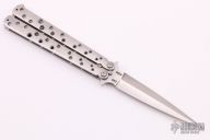 This Balisong by Korth Cutlery features a satin finished double-edged dagger style blade with a single fuller. The handles are satin finished titanium with t-latch. #082 on the blade. Runs on IKBS bearings. Comes with a zippered case. Has a couple very light scratches, otherwise excellent condition.