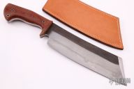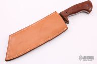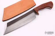 This Large Chopper from Charlie Edmondson features a hand rub satin finished blade with swedge and nice hamon, forge finished flats, .339" blade stock and 2.765" blade depth, full tang construction. The handle has brown canvas micarta scales. Comes with a brown leather sheath. Has some light scratches and patina, otherwise excellent condition. This thing is a beast.