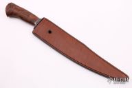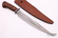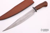 This Bowie from Charlie Edmondson features a hand rub satin finished blade with swedge and nice hamon, .319" blade stock and 1.601" blade depth, hidden tang construction. The handle has a blued steel guard and wood grip with blued steel pins. Comes with a brown leather sheath. Excellent condition. This thing is a pretty cool.