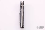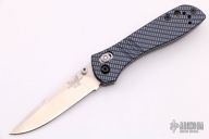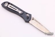 This knife by Benchmade features a satin finished ATS-34 blade with dual thumbstuds. The handle has anodized aluminum scales with stainless steel liners and tip up reversible clip. "May 2000" on the blade. Comes with original box and papers. Excellent condition.