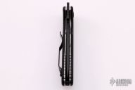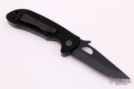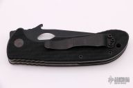 This Endeavor from Emerson Knives features a black clip point blade with tumbled flats, satin grinds swedge, thumb hole, wave features and notched thumb rest. The handle is comprised of black G10 scales over titanium liners and black G10 backspacer. Lanyard hole in pommel and black coated stainless steel tip up clip. Includes original box and papers. Excellent condition. S/N 645 and dated 2014.