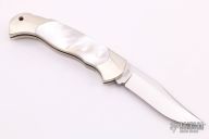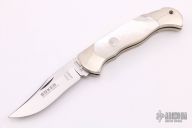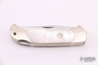 This knife by Boker features a clip point blade with nail nick. The handle has a nickel silver frame with mother-of-pearl inlays. Comes with nylon sheath.  Light scuffs and scratches are visible on the blade and bolsters otherwise the knife is in excellent condition.