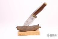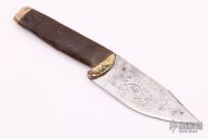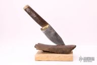 This large skinner by Miles Martin features a satin finished blade with custom etching on the blade, .057" blade stock and 1.996" blade depth, hidden tang construction. Blade is made of L6 from an1800s crosscut saw blade from an old Alaska mine camp. The handle has a cast bronze guard from a Yukon River barge propeller, fossil ice age bison rib bone found on Cosna River in interior Alaska with a mammoth ivory butt cap with brass pins. Comes with a stand that is made from a mammoth leg bone shard found on Cosna River in interior Alaska. New from maker. #951