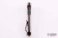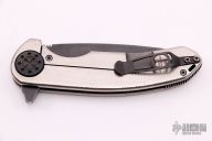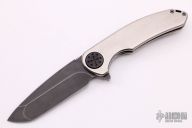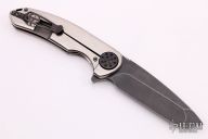 This Large F3 by Curtiss Knives features a dark stonewashed blade with notched thumbrest and flipper. The handle has an orange peel finished titanium frame with tip up black titanium clip. Rides on bearings, nice detent and lockup. Excellent condition. Comes with original zippered case.