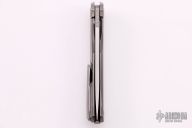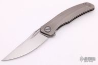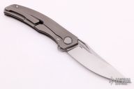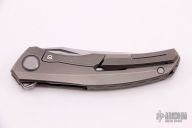 This Quantum by Shirogorov features a blasted blade with notched thumbrest and flipper. The handle has a blasted and milled titanium frame, backspacer, tip up titanium clip with hidden screws. Rides on MRBS, nice detent, lockup and blade seating. Comes with original box and COA. Excellent condition.
