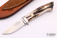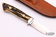 This Rare Small Size Drop Point Hunter by the Late Bob Loveless features a satin finished blade with .187" blade stock and .889" blade depth, full tapered tang construction. The handle has a nickel silver guard with stainless pins, stag scales with red liners and a lanyard hole. Comes with original brown leather sheath and a zippered case. Sheath and blade are marked "195". Has some light scratches, otherwise excellent condition. Rare piece in a rare size from a rare breed.