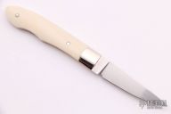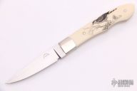 This Knife by R. A. Frazier features a hand rub satin finished blade, .110" blade stock and .553" blade depth, full tang construction. The handle is comprised of dovetailed nickel silver bolsters and scrimshawed mammoth ivory scales with nickel silver pins. Excellent condition.