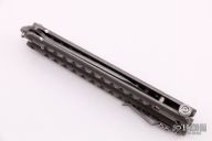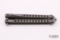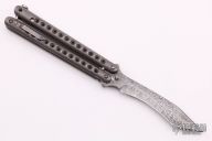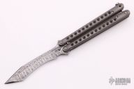 This Balisong features a Stainless Damascus recurved blade. The handle features bead blasted titanium complemented by a matching tip up pocket clip. Includes a padded zippered case. Excellent condition.
