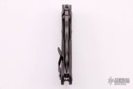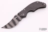 This KRT by Strider Knives features a tiger stripe upswept blade with thumbhole and notched thumbrest. The handle has a flame finished titanium frame with a matching titanium tip up clip. Nice detent, lockup and blade seating. Excellent condition.