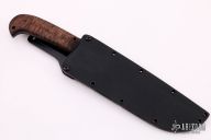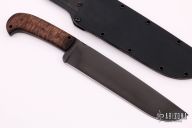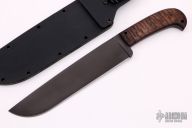 This Camp Knife by Winkler Knives features a black Caswell finished blade with a notched thumbrest, .244" blade stock and 2.050" blade depth, full tang construction with black linen micarta scales. Comes with a kydex sheath, original box and papers. New from maker. Knife Specifications Blade steel: 80CrV2 Black oxide no-glare finish Blade length: 9.5" Overall length: 14.75" Blade thickness: .248" Full skeletonized tang Sheath Lined Kydex® Nylon webbing belt loops Designed for belt or pack carry. New from maker.