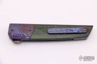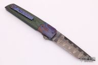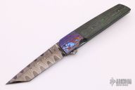 This Large Gent's Tanto flipper by Jason Clark features a Vegas Forge San Mai Damascus blade with a checkered flipper and false top edge. The handle has a dovetailed Damtanium bolsters, fat carbon scales, orange peel finished and anodized titanium liners, Damtanium floating backspacer and tip up clip. Rides on IKBS, nice detent, lockup and blade seating. Comes with a leather slip sheath and COA. Excellent condition.