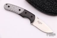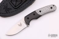This Benchmade Snody Activator features a tumble finish blade with notches along the blade spine, .135" blade stock, .890" blade depth. Full tang construction with carbon fiber and silver twill G10 handle scales. Includes leather sheath. Has been resharpened, otherwise good condition.