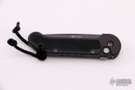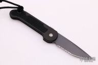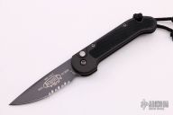 This Mini UDT by Microtech has a black partially serrated blade. The handle is black aluminum with non-slip inserts. Side opening coil-spring automatic. Dated 12/2002 and s/n 3330. Includes original box and paperwork. Excellent condition.