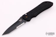 This 9100SBK by Benchmade features a black coated tanto blade with false top edge, partial serrations and a notched thumbrest. The handle is black aluminum with a black tip up stainless steel clip. Comes with box and papers. Excellent condition.