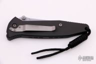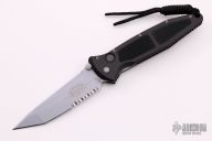 This Socom D/A by Microtech is a discontinued model, it features a clip point silver partially serrated blade with notched thumbrest and dual thumbstuds. The handle has a black aluminum frame with rubber inserts, single stainless steel liner and tip down clip. Excellent condition. Dated 5/99. Comes with original sheath, box and papers.