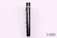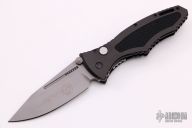 This Keating Hornet by Masters of Defense has a bead blasted clip point blade with dual thumbstuds and fullers. The handle has a black anodized aluminum frame with non-slip inserts, and black stainless steel tip-down clip. Excellent condition. Comes with original box, sheath and papers.