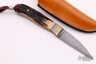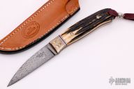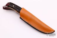 This Knife from Mr. Pease features a Damascus blade with .150" blade stock and .796" blade depth, mortise/frame tang construction. The handle has mokume bolsters, stag scales with mosaic pins, red/white/black spacers and a brown canvas micarta frame. This piece is new from Mr. Pease and comes in custom leather sheath by TFC Leather.