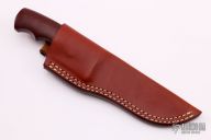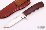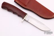 This Model 1 Ozark Hunter by Morseth Knives features a satin finished clip point laminated steel blade with .174" blade stock and 1.023" blade depth, hidden tang construction. The handle has a nickel silver guard, red linen micarta grip, red/brass/black spacers. Comes with a brown leather sheath. Excellent condition. This knife was made by Bob Dozier in 1992 for Morseth.