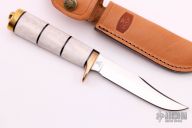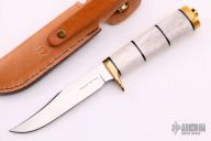 This knife by Buck Knives features a satin finished clip point blade with false top edge, .143" blade stock and .799" blade depth, hidden tang construction. The handle has a brass guard and butt with a stacked elk and black micarta grip. Comes with brown leather sheath, original wooden box and papers. Excellent condition.