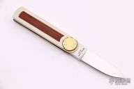 This knife by Kershaw is a rotary lock, similar to a Paul Knife. Rotate the brass circle to open and close the knife. Nickel silver frame with wood inlays. Excellent condition. Rare in this condition. Comes with zippered case.