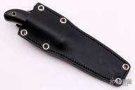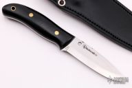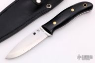 This bushcrafter by Spyderco features a black G-10 handle with brass pins and lanyard hole. It is a satin finished scandi ground blade that has 1/8" thickness and 1 1/8" depth. Has a black leather sheath with belt loop. Comes with original box. Has a few light scratches on the blade and a little rust on the spine of the blade, otherwise good condition.
