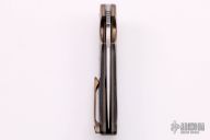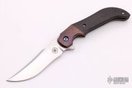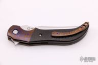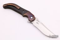 This Lhvtak Design flipper by David Mosier features a hand rub satin finished recurve blade with flipper and notched thumbrest. The handle has mokuti bolsters and tip up clip, lightning strike carbon fiber scales, bead blasted titanium liners and a black g-10 backspacer. Rides on IKBS, nice detent, lockup and blade seating. Comes with a zippered case. Excellent condition.