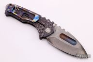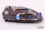 The Praetorian is a Marquee knife. It is a TON of blade in a relatively small package. This design incorporates aerospace materials, space age coatings, old school metallurgy, thoughtful design and hand craftsmanship that is rare but alive and strong in this modern world. This particular knife features a carved and anodized finished titanium frame and blade, .200 thick titanium scales, all titanium hardware, and flamed titanium clip, tip up carry. Very nice (early) lockup, extremely smooth action, and perfect detent. Dead center blade seating. Comes with hard plastic case. Knife is in excellent condition, shows no signs of use/carry.
