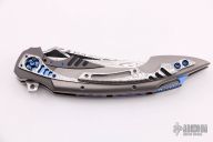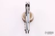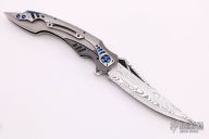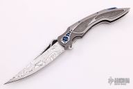 This Curv Flipper by Ron Best features a Damasteel blade with flipper. The handle has a titanium frame with anodized titanium backspacer, tip up Damasteel clip and pivot collars, has marble carbon fiber and Damasteel inlays in the handle, anodized titanium hardware. Rides on bearings, nice detent, lockup and blade seating. #135 inside the frame. Comes with original box. Excellent condition.