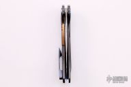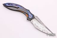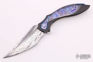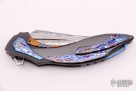 This Orion Flipper by Ron Best features a Damasteel blade with flipper. The handle has a zirconium frame with anodized titanium backspacer, tip up mokuti clip and pivot covers with anodized titanium borders, has mokuti inlays in the handle, no visible hardware. Rides on bearings, nice detent, lockup and blade seating. 11-19-19 inside the frame. Comes with original box. Excellent condition.