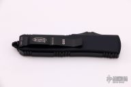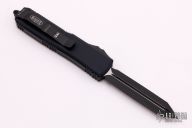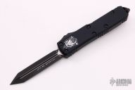 This UTX-85 OTF automatic by Microtech features a black double-edged "Spartan" blade. The handle has a black aluminum frame with all black hardware, tip down black stainless steel clip. Serial number 023 and dated 08/2019. Comes with original box and papers. New from maker at the 2019 USN Gathering.