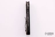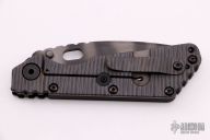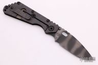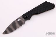 This Mick Strider SMF Fatty framelock folder features a tiger striped blade with thumbhole and notched thumbrest. The handle has a black aluminum and flamed titanium frame with titanium clip, tip up carry. Jimping on blade spine. Nice lockup, detent, and blade seating. New from maker.