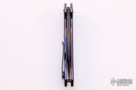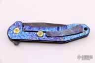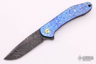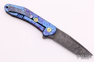 This Machairi by Chad Nichols features a Stainless Damascus blade with false top edge and a flipper. The handle has a MokuTi frame with anodized titanium hardware, tip up MokuTi clip with hidden screws. Rides on bearings, nice detent, lockup and blade seating. Comes with a zippered case. New from maker.