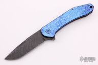This Machairi by Chad Nichols features a Stainless Damascus blade with false top edge and a flipper. The handle has a MokuTi frame with anodized titanium hardware, tip up MokuTi clip with hidden screws. Rides on bearings, nice detent, lockup and blade seating. Comes with a zippered case. New from maker.