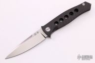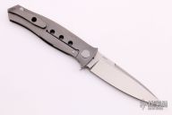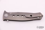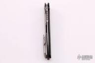 This "Russian Dr. Death" flipper with carbon fiber presentation side scale is a collaboration between Shirogorov and Tom Mayo. This one is #74 of 200 that was made. The blade features a very fine bead blasted/tumbled finish and notched thumbrest and flipper. The handle has a titanium lock side, classic hole pattern, titanium backspacer with lanyard hole and jimping, tip up titanium clip with hole through clip and all the way through the frame, stainless lockbar insert. Has the Mayo and Shirogorov logos near the butt. Nice detent, lockup and blade seating. Knife is in excellent condition. This knife is chalked full of details and is an amazing representation of Tom Mayo's Dr. Death. Comes with zippered case