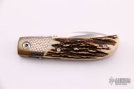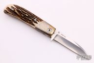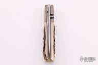 This TTF-6 linerlock folder by Bob Terzuola features a stonewashed blade with a single thumbstud. The handle has super conductor bolsters, stag scales, titanium liners and an ivory paper micarta backspacer. Smooth action. Nice detent, lockup and blade seating. Comes with a zippered case. Excellent condition.