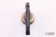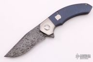 This Custom Lahar by Tim Galyean features a Damascus blade with notched flipper and thumbrest. The handle has a two-tone jigged titanium frame with a satin finished titanium tip down clip. Rides on bearings, nice detent, lockup and blade seating. Comes with a zippered case. Excellent+ condition.