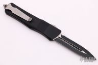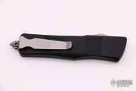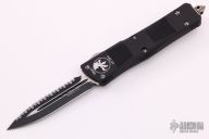 This Troodon by Microtech features a black blade with one fully serrated edge. The handle has a black aluminum frame with blasted hardware and tip down clip. Dated 01/2011 s/n 08587. Excellent condition. Comes with original box and papers.
