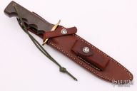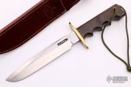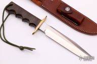 This Model 16 from Randall Made Knives features a satin finish clip point blade with sharpened top edge, 0.230" blade stock and 1.239" blade depth. The handle is comprised of a brass double guard and green linen micarta finger grip handle. Brass lanyard tube with lanyard in pommel. Includes brown leather sheath with belt loop. Excellent condition.