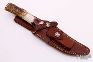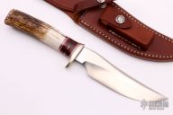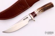 The Model 27 is an ideal all-around heavy-duty sportsman's knife. This knife has a satin finished blade, .221" blade stock and 1.360" blade depth, hidden tang construction. The handle has a nickel silver guard, and stag handle with red, duralumin, white, red linen micarta, black and brass spacers, and a nickel silver butt plate. Comes with a brown leather sheath. Excellent condition.