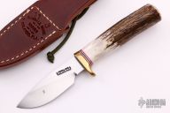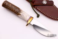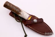 The Model 11 is the original drop point blade. Designed by Tommy Thompson, noted Alaskan guide, in 1952 for big-game skinning, with point dropped below top of blade to prevent cutting too deeply through skins when used point first. The blade is satin finished with a notched thumbrest, .149" blade stock and 1.019" blade depth, hidden tang construction. The handle has a brass guard, stag handle, red/white/blue spacers. Comes brown leather sheath with belt loop. Small spot of light oxidation on the left side of the blade otherwise, excellent condition.