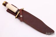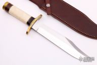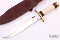 The Model 12-9c Sportsman Bowie by Randall Made Knives was made to meet the demand for a heavy-duty sporting knife of the Bowie type. This knife has a 9" carbon steel blade with sharpened top edge, .197" blade stock and 1.642" blade depth, hidden tang construction. The handle has a forward curved brass guard and butt, beautiful walrus tusk with stacked leather/brass/black spacers. Comes with a brown leather sheath. Excellent condition.