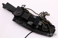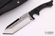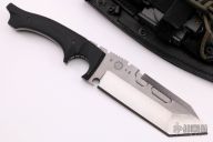 This AirKat Apache from Dwaine Carrillo is a Joel Pirella Design, it features a satin finished blade with sharpened top edge and notched thumbramp, .253" blade stock and 2.047" blade depth, full tang construction. The handle is comprised of black G10 scales. Lanyard hole in pommel with lanyard. Excellent condition. Comes with a deluxe black leather sheath with compass, sharpening steel and magnesium block with striker.