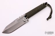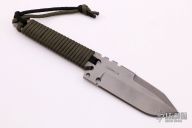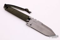 This AirKat from Dwaine Carrillo features a bead blast finished blade with notched thumbrest and sharpened top edge. The handle is comprised of paracord over full tang construction. Lanyard hole in pommel with lanyard. Excellent condition.