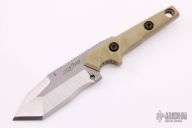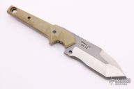 This Model 5 From Dwaine Carrillo features recurve tanto blade with .250" thick stock and 1.654" blade depth, full tang construction. The handle has tan G-10 scales. Notched thumbrest and ringer rests. Excellent condition.