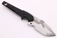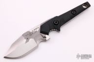 This Vulcan Model 5 From Dwaine Carrillo features recurve blade with .253" thick stock and 1.851" blade depth, full tang construction. The handle has black G-10 scales. Notched thumbrest and ringer rests. Excellent condition. Comes with kydex sheath.