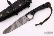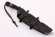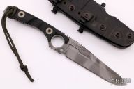 This Blackhawk by Dwaine Carrillo features a tiger stripe finished blade with sharpened top edge and a notched thumbrest, .194" blade stock and 1.368" blade depth, full tang construction. Hollow ground blade. The handle has black paper micarta scales with black screws. Excellent condition. Comes with kydex sheath.