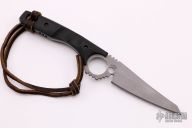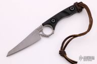 This Ringed Airkat by Dwaine Carrillo features a bead blast finished blade with a notched thumbrest, .152" blade stock and .906" blade depth, full tang construction. Hollow ground blade. The handle has black paper micarta scales with black screws. Has some light staining on the blade, otherwise excellent condition.